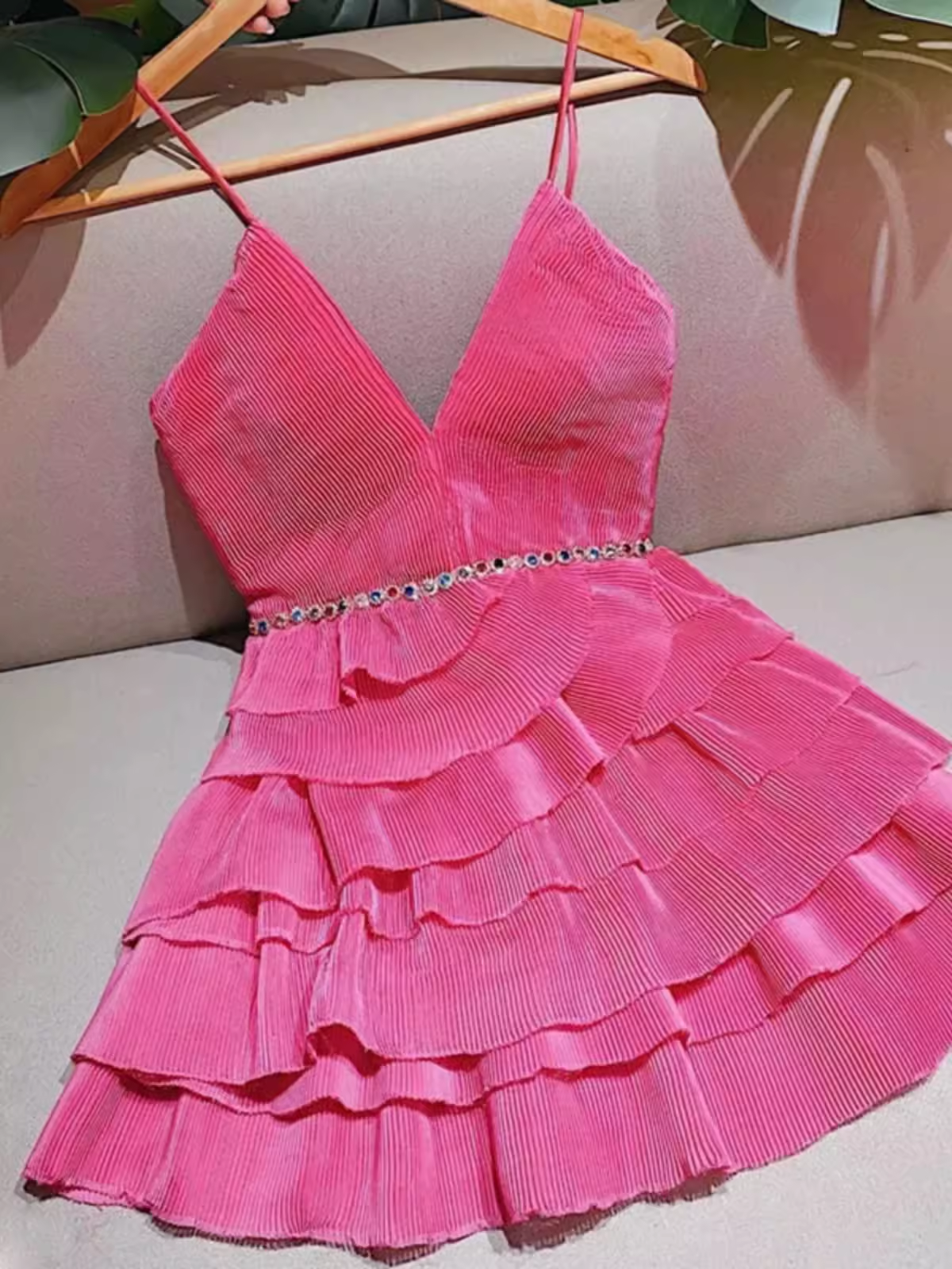 Simple A line Spaghetti Straps Pink Birthday Dress Chiffon Homecoming Dresses HZ1024