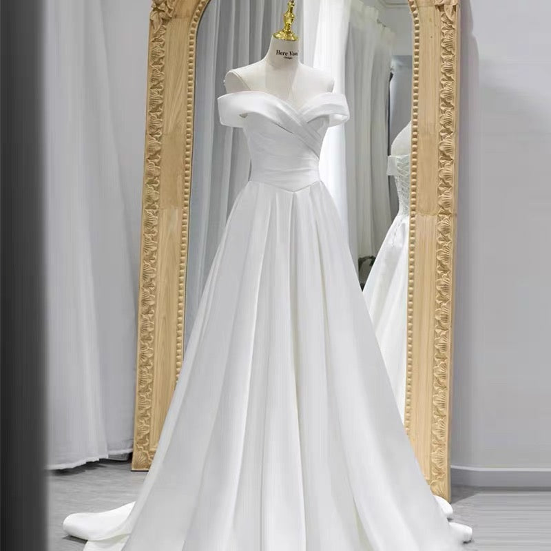 Classy A line Off The Shoulder Short Sleeves Floor Length Satin Wedding Dresses HZ1024