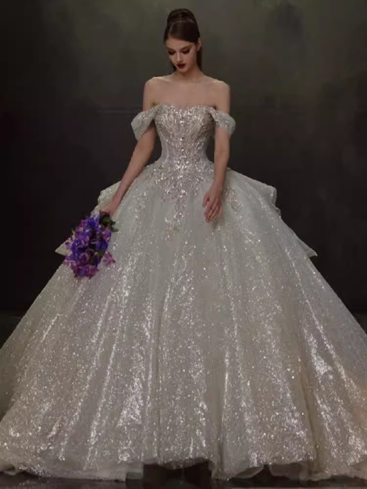 Elegant Ball Gown Off The Shoulder Sequin Short Sleeves Sequin Wedding Dresses HZ1024