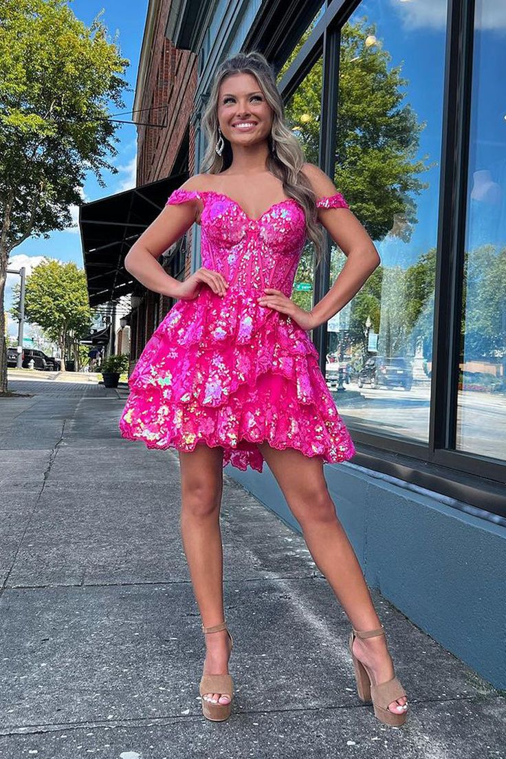 Pretty A-Line Off the Shoulder Hot Pink Sequin Lace Short Homecoming Dresses HZ1024