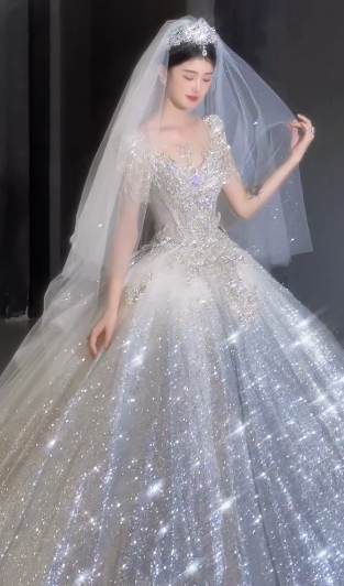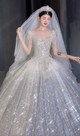 Shiny Ball Gown Tulle Sequin Beaded Short Sleeves With Veil Long Wedding Dresses HZ1024