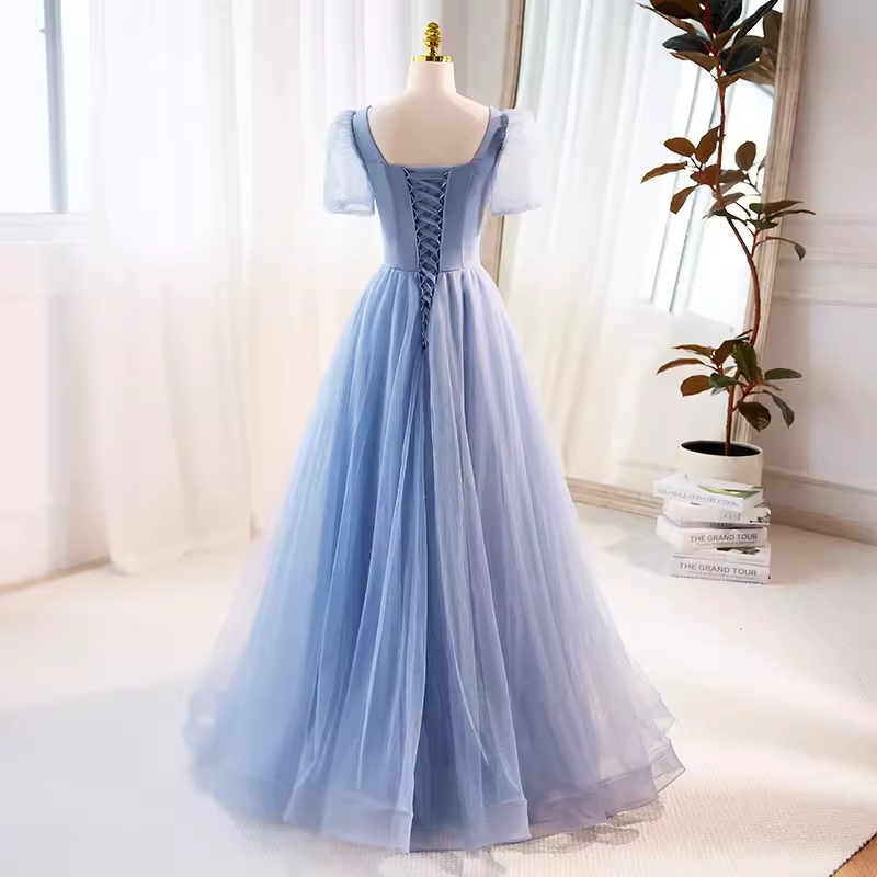 A line Short Sleeves Long Tulle Blue Prom Dress HZ1024