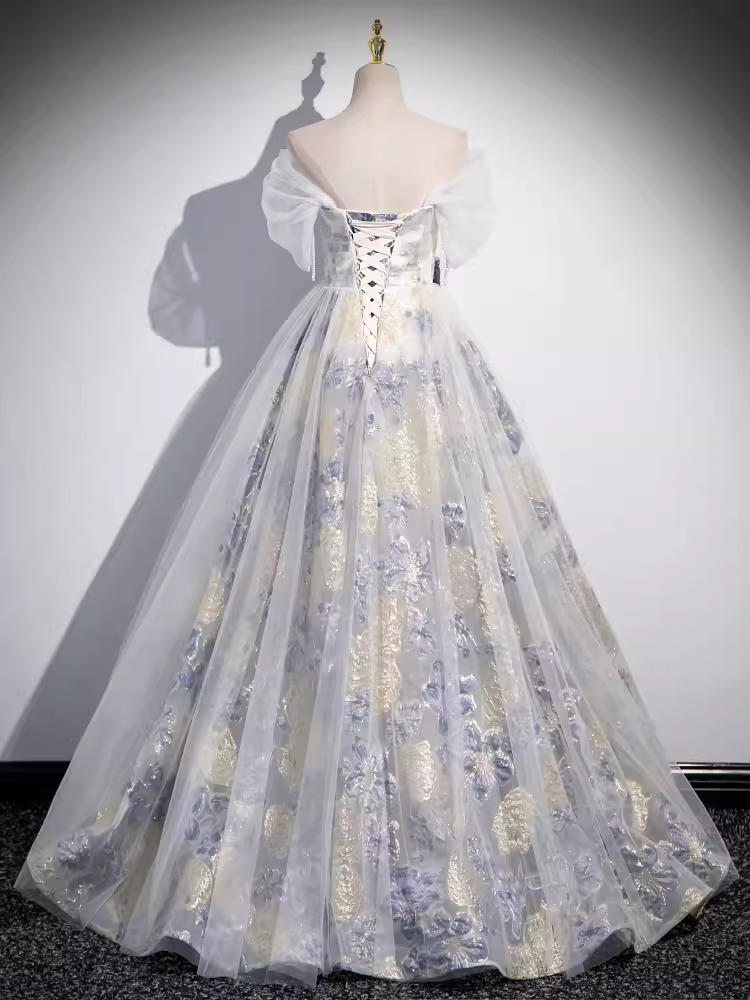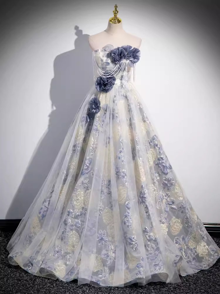 Beautiful A line Strapless Floral Blue Long Prom Dress HZ1024