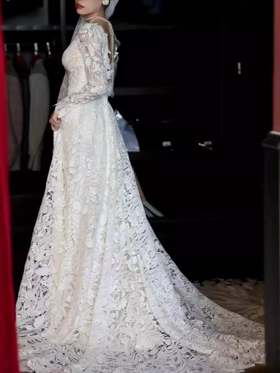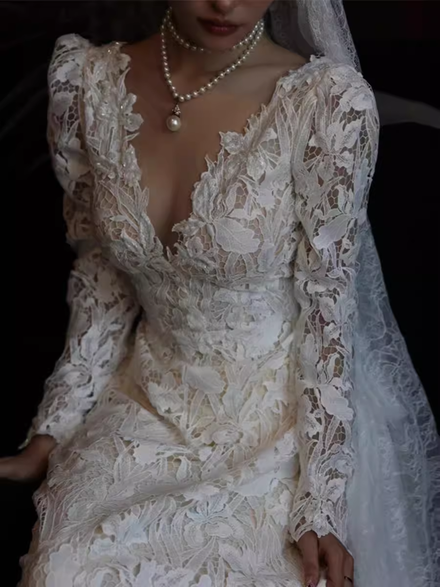 Chic A line V Neckline Lace White Wedding Dress With Long Sleeves HZ1024