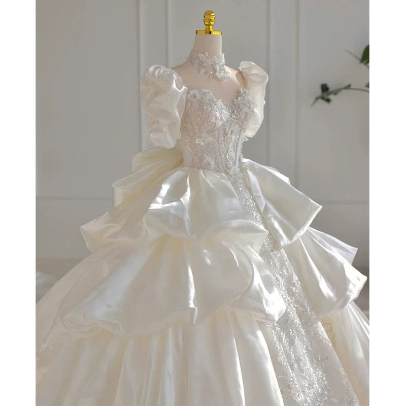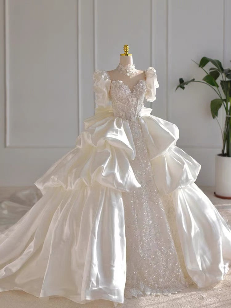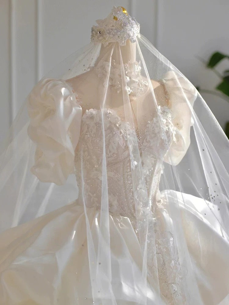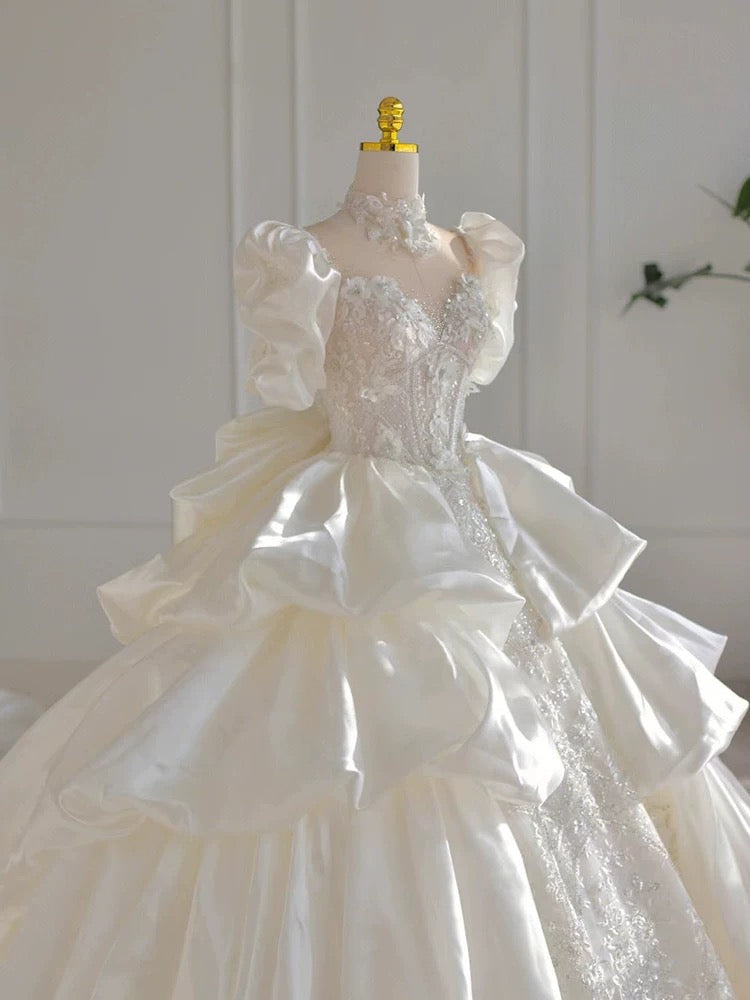 Dreamy Ball Gown High Neckline Short Sleeves White Lace Wedding Dresses With Beads HZ1024
