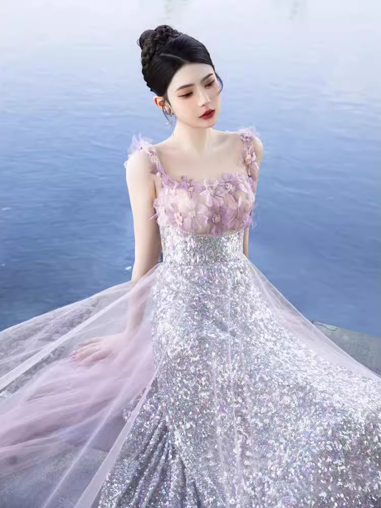 Purple tulle sequin long prom dress purple sequin evening dress HZ1024