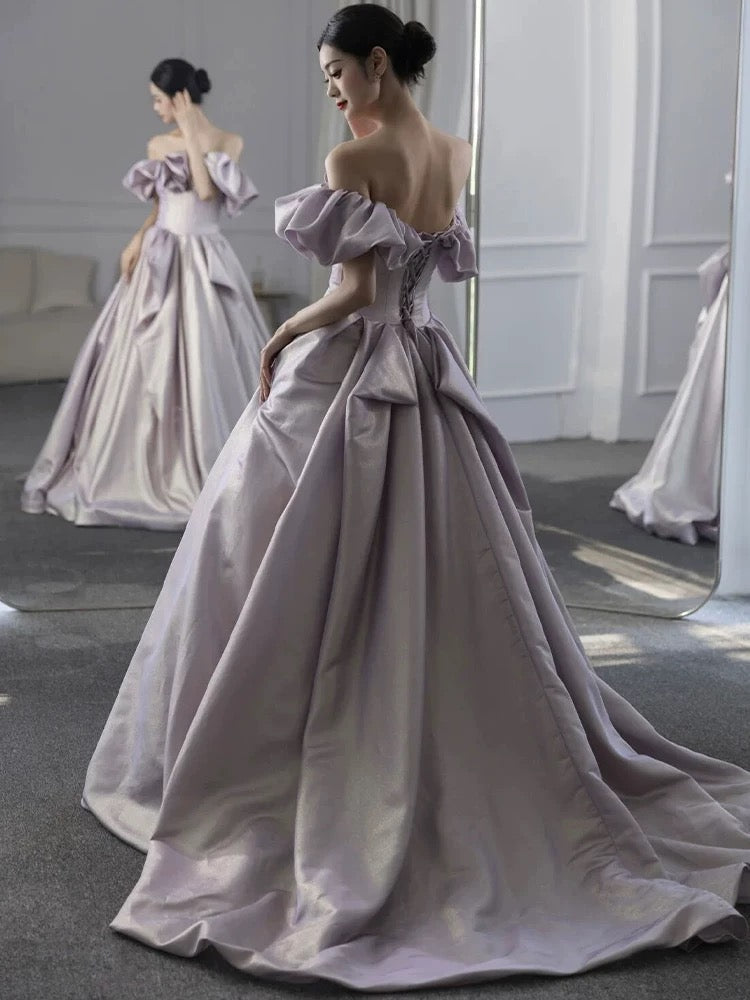 Elegant Ball Gown Off The Shoulder Lilac Short Sleeves Evening Dress Long Prom Dresses HZ1024