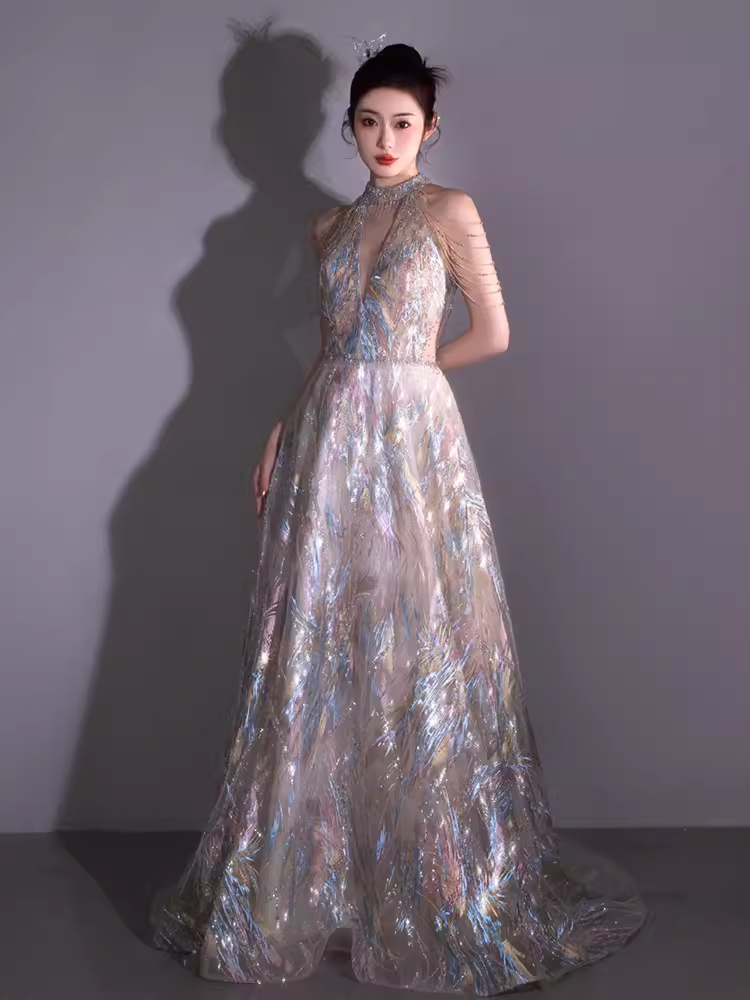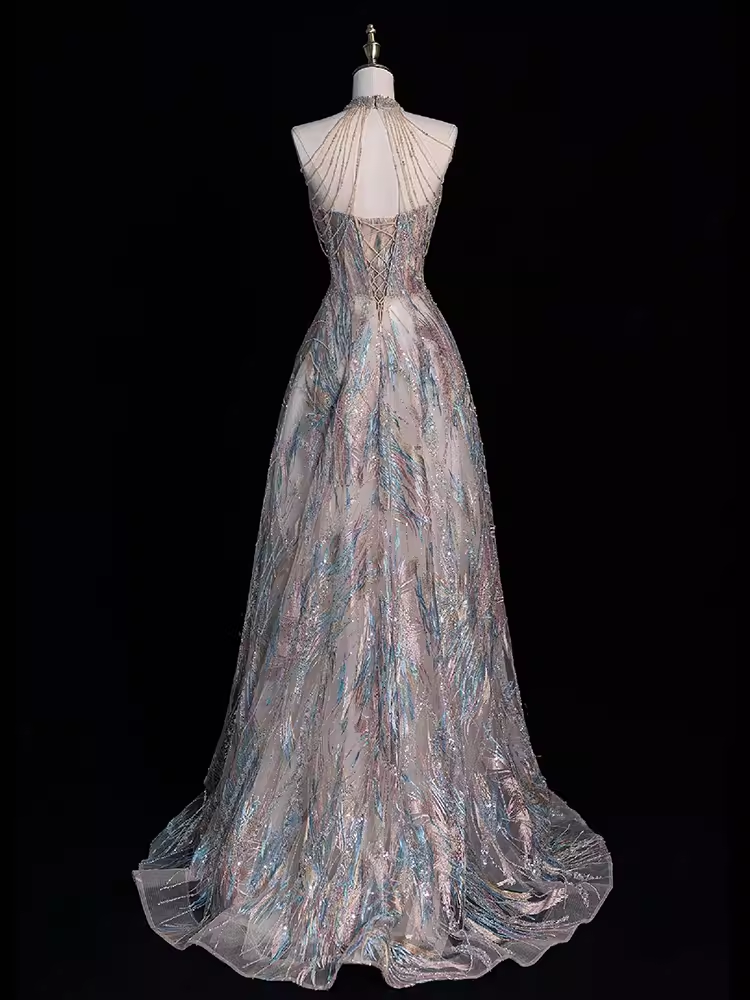 Fairytale A line High Neckline Sequin Beads Long Evening Dress Prom Dresses HZ1024