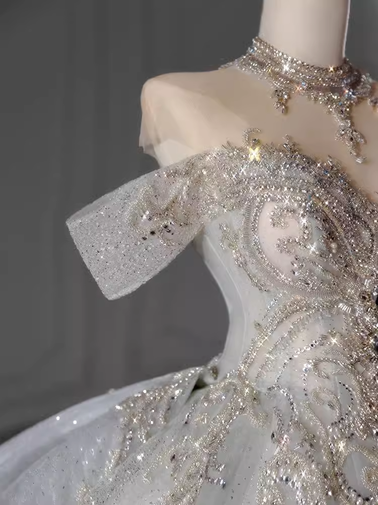 Luxury Ball Gown Off The Shoulder Short Sleeves Sequin Wedding Dress HZ1024