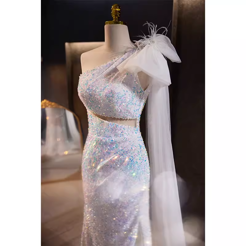 Luxury Mermaid One Shoulder Long Sequin White Prom Dress HZ1024