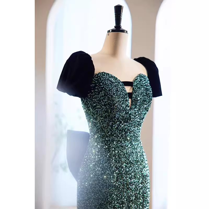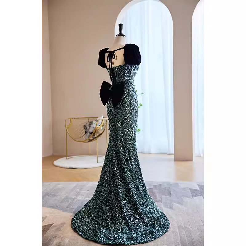 Mermaid Short Sleeves Green Sequin Long Prom Dress HZ1024