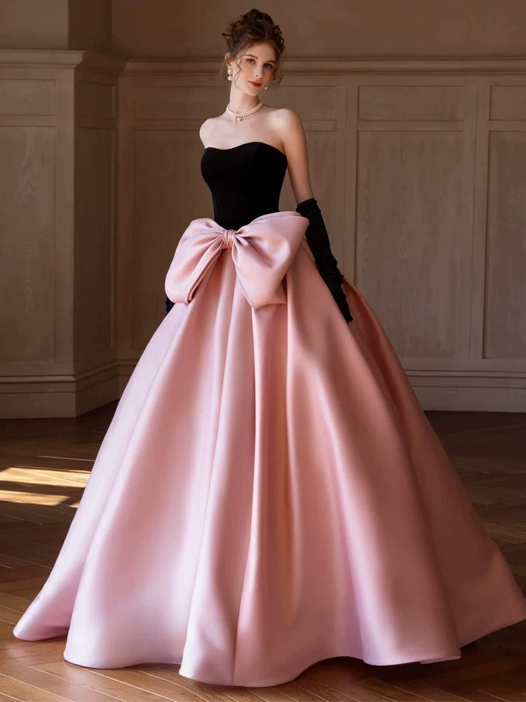 Modest Ball Gown Strapless Pink Prom Dress With Bow Long Evening Dresses HZ1024