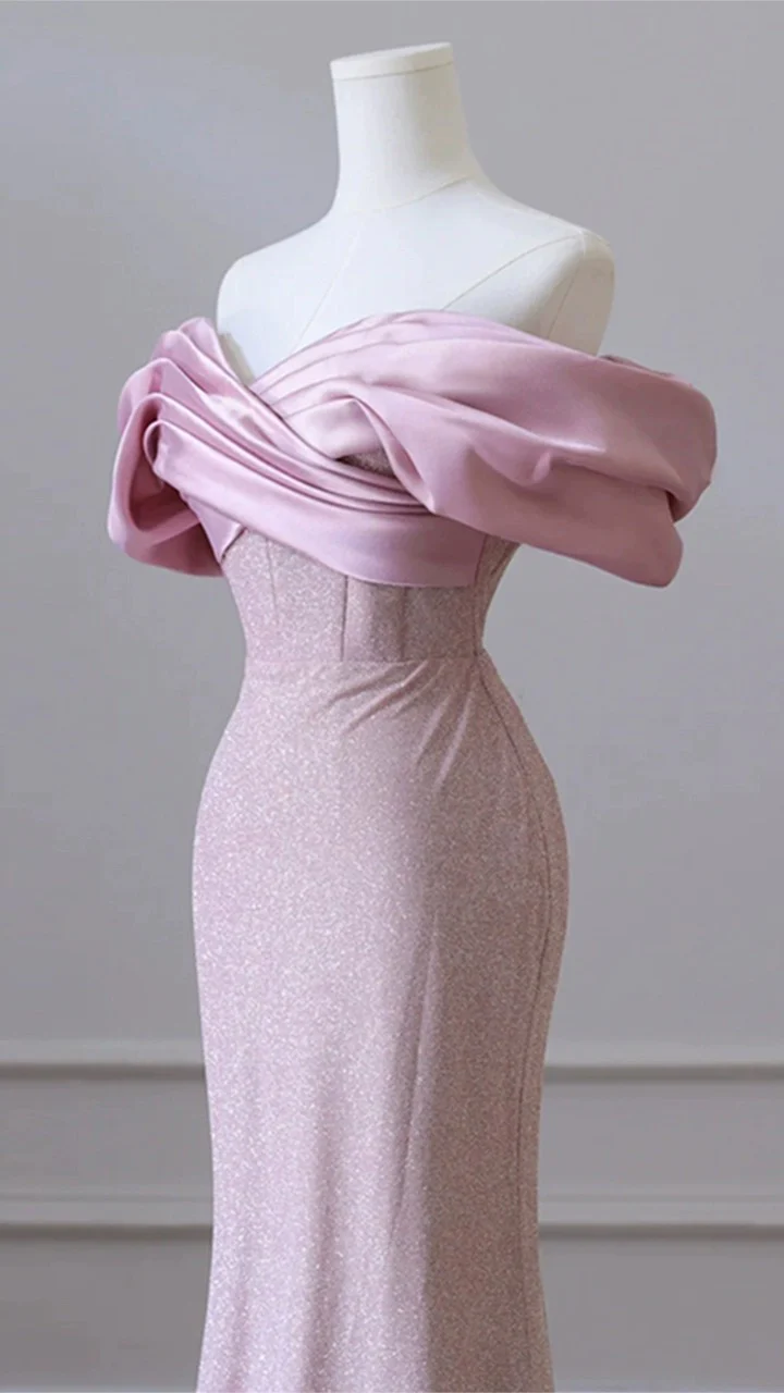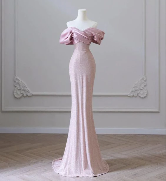 Modest Mermaid Off The Shoulder Sequin Pink Long Prom Dress HZ1024