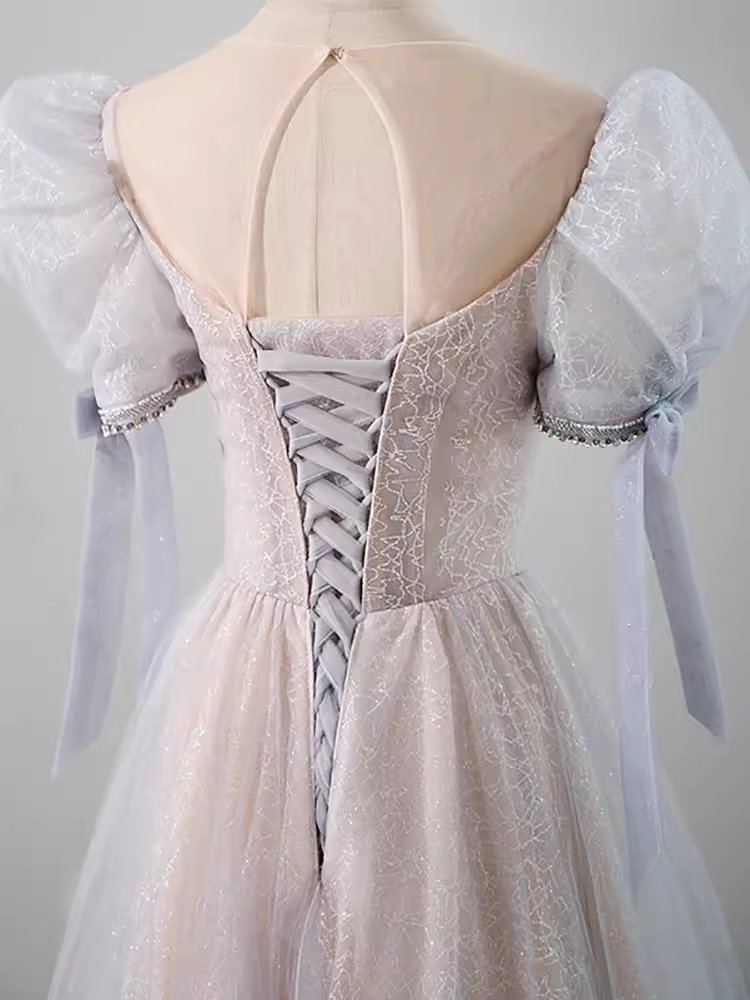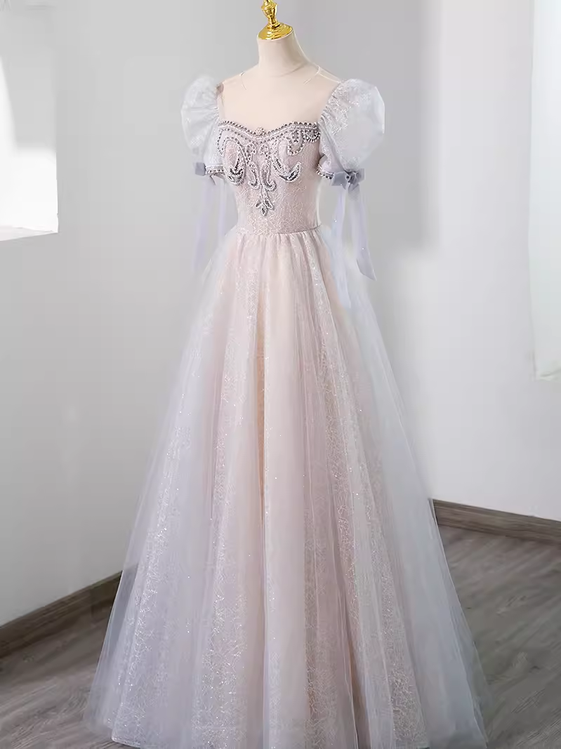 Pretty A Line Scoop Short Puffy Sleeves Pink Tulle Beads Long Prom Dresses HZ1024