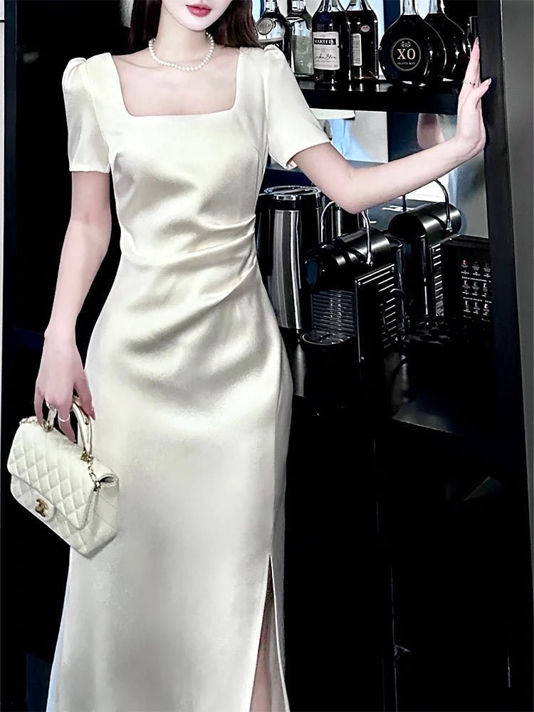 Pretty Sheath Square Neckline Short Sleeves Slit Ivory Long Prom Dresses HZ1024