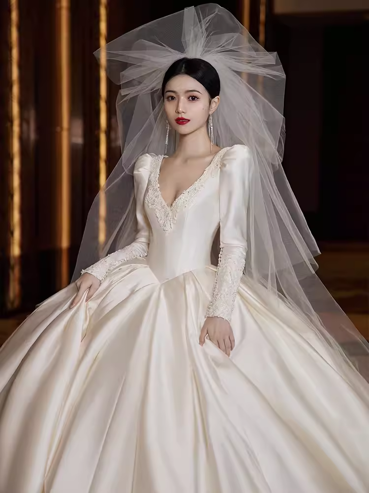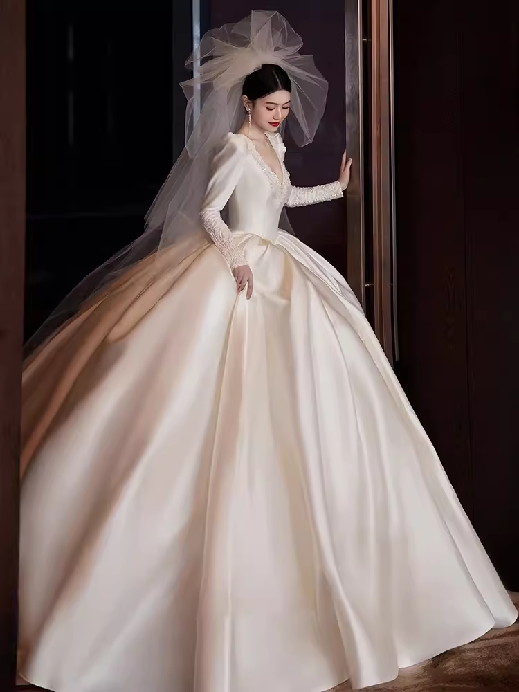 Princess Ball Gown V neckline Long Sleeves Lace Wedding Dresses HZ1024