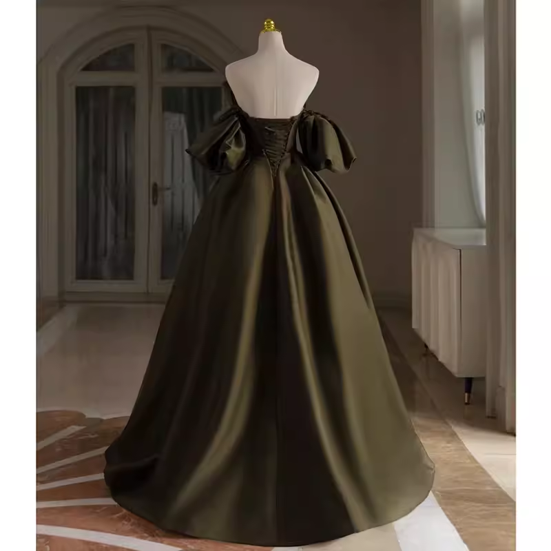 Sexy A line Off The Shoulder Short Sleeves Green Satin Long Prom Dress HZ1024