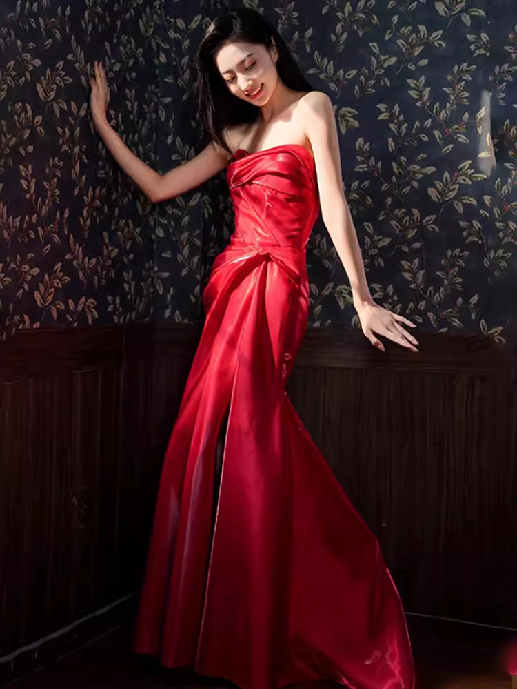 Sexy Mermaid Sweetheart Satin Long Prom Dresses Red Slit Birthday Outfits HZ1024