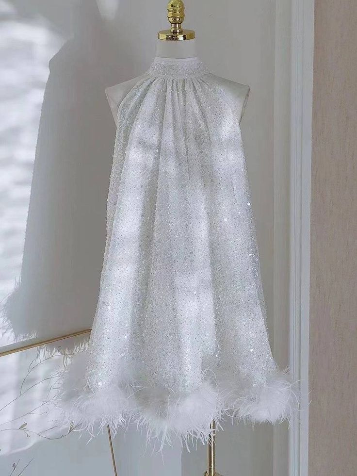 Simple A Line High Neckline Sequin Short White Homecoming Dress HZ1024