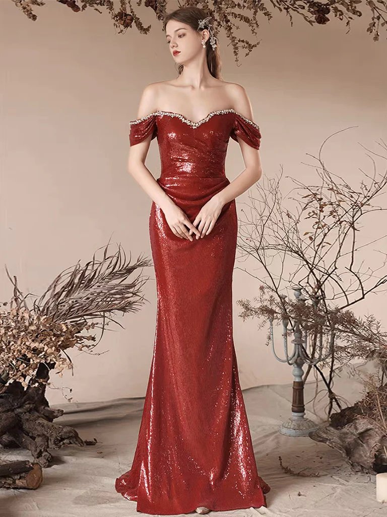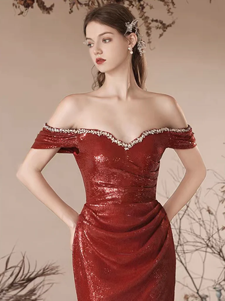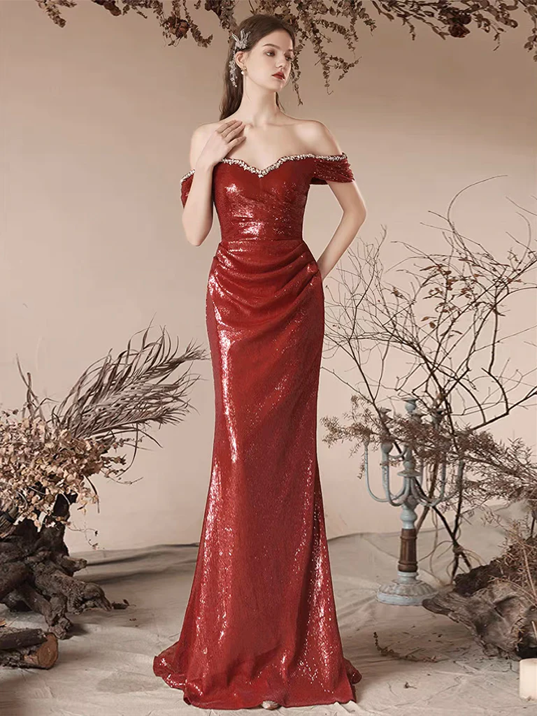 Simple Off Shoulder Sequin Mermaid Burgundy Long Prom Dress HZ1024
