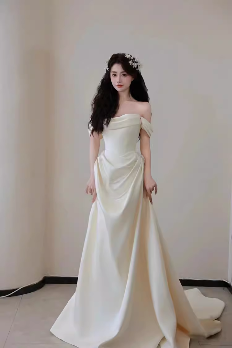 Vintage A line Off The Shoulder White Wedding Dress With Short Sleeves HZ1024