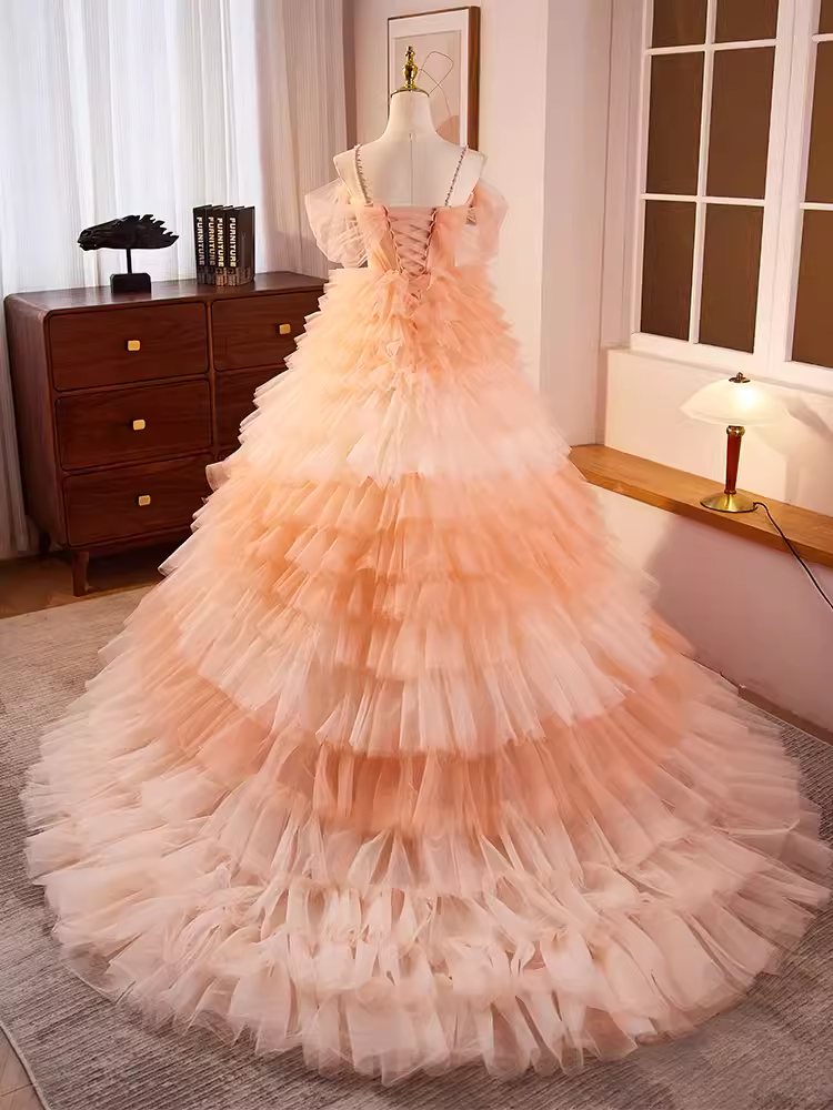Pink tulle lace long prom dress pink lace prom gown HZ1024