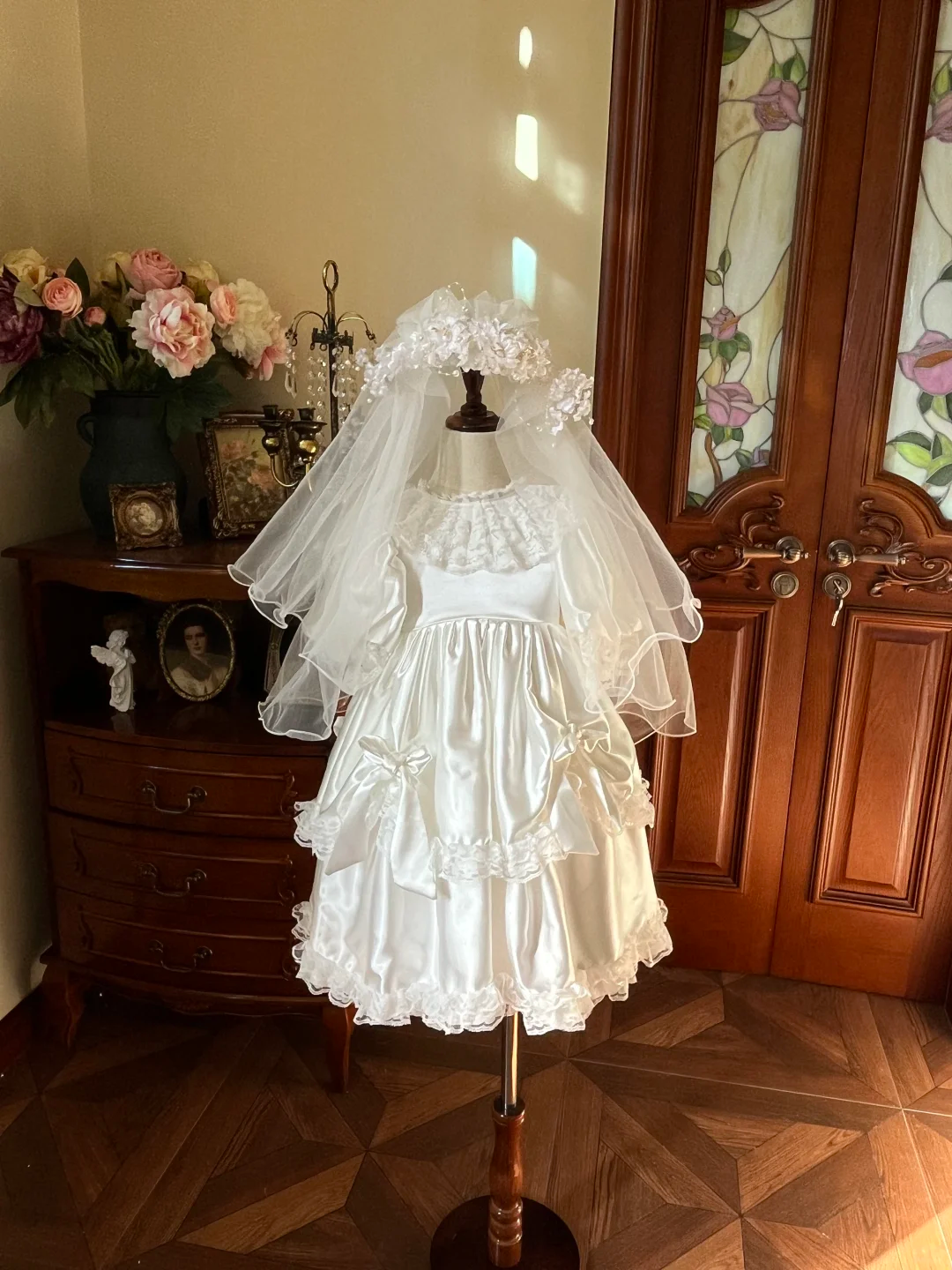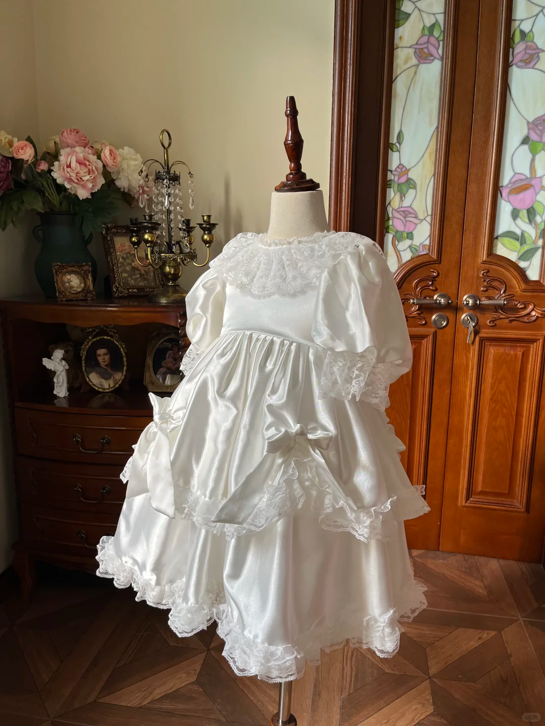 Vintage Princess A Line Tiered Satin Lace With Short Sleeves Flower Girl Dress HZ1024